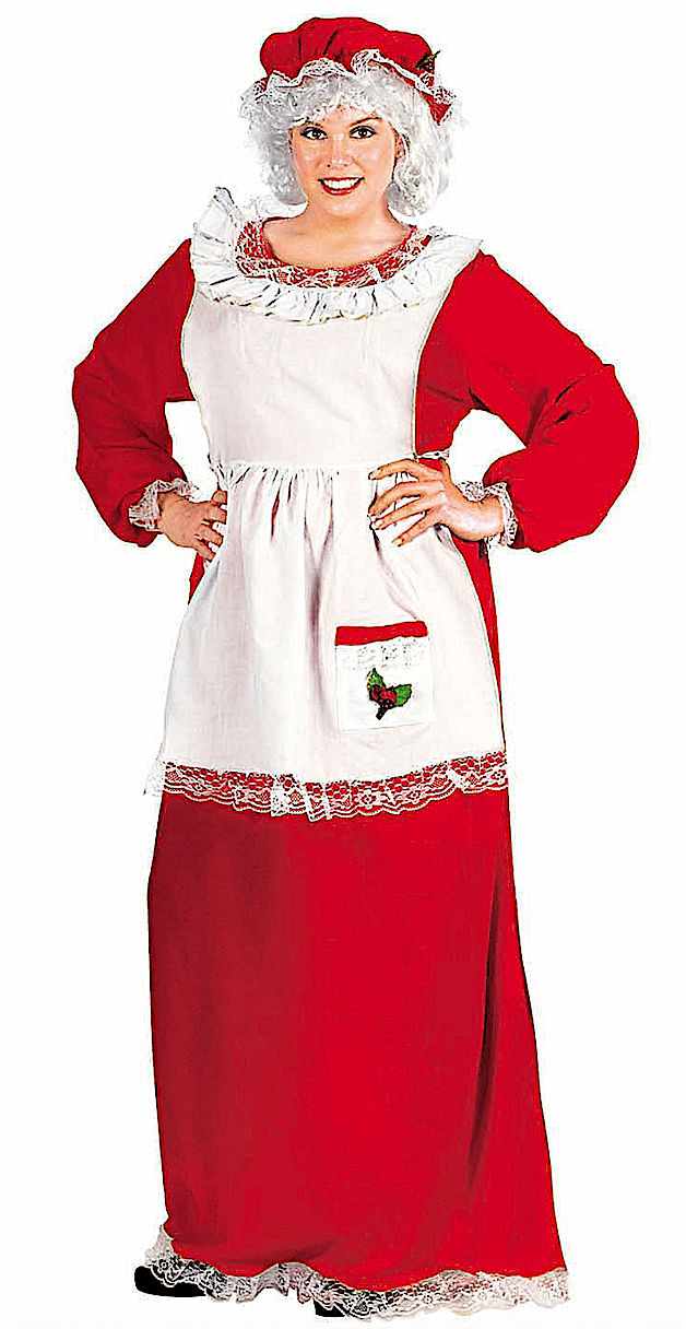 Our Mrs. Santa Claus costume features a full-length red dress with lace at the neckline, wrists, and hemline, a matching lace-trimmed red mop cap with a holly applique accent, and a full white pinafore apron with ruffles and a pocket that has a holly applique trim.