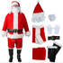 The costume comes with a white beard, red and white soft hat with attached wig, red velour pants, red and white velour jacket and a shiny black belt that goes around the waist.