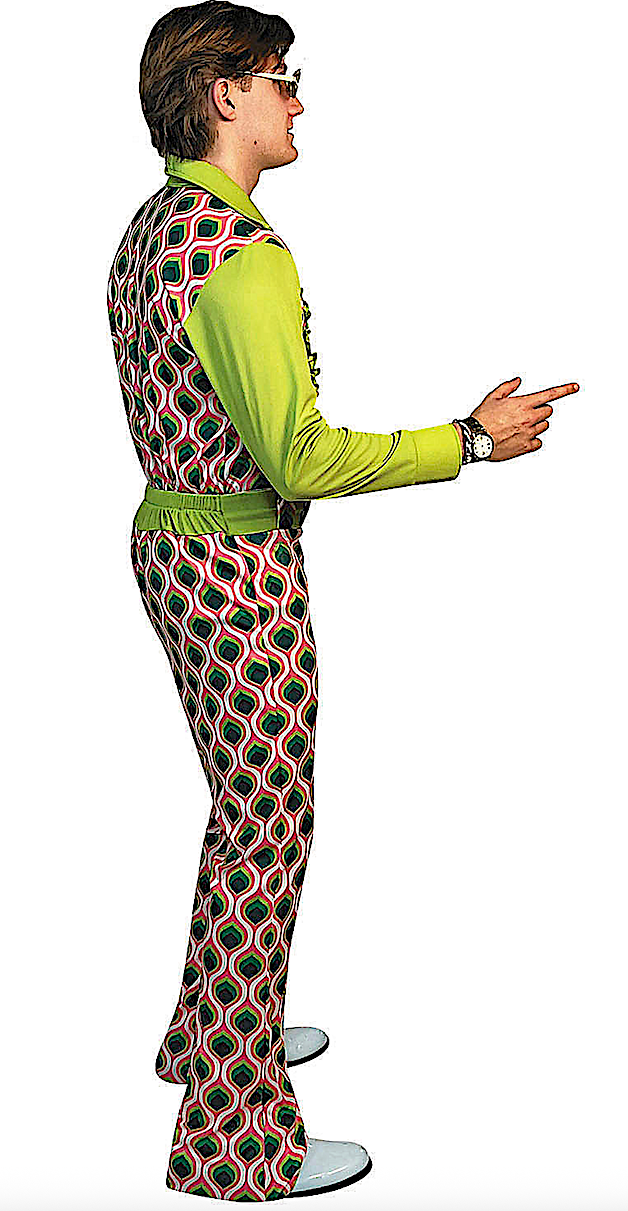 .Adult Swaggertown Pink and Green Feather-Print Pantsuit Costume includes a deep V-neck shirt with a ruffled oversized collar and feather print which is attached to the high-waisted jumpsuit. The high waist wide legged pants have attached belt with belt loops, a buckle and an elasticized waistband.
