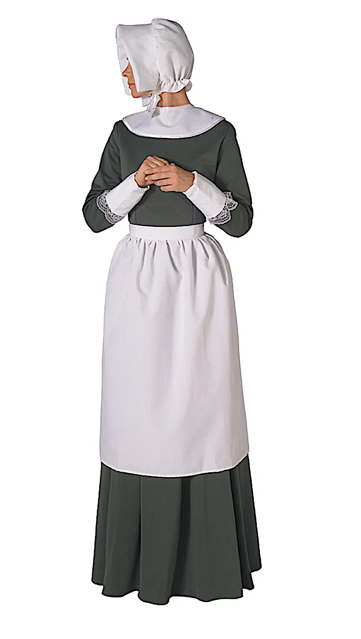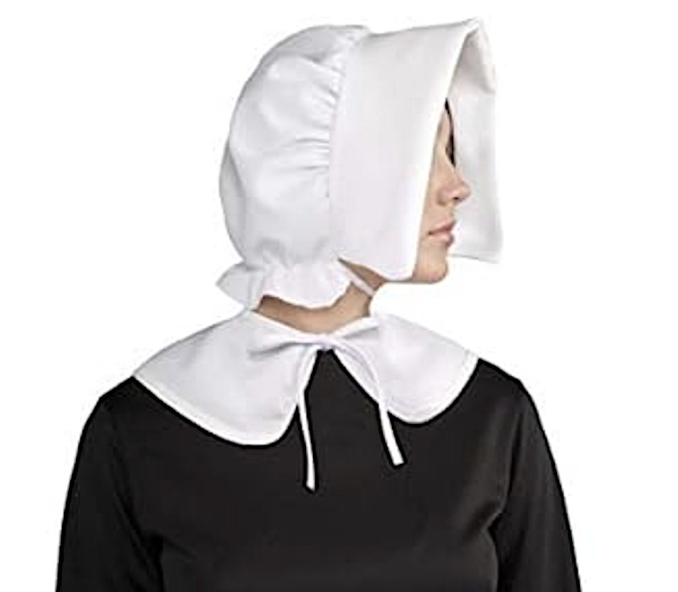 This Women's Pilgrim Accessory Kit gives any long dress a pilgrim look. Includes bonnet, apron, cuffs, and collar made of heavy weight cotton.