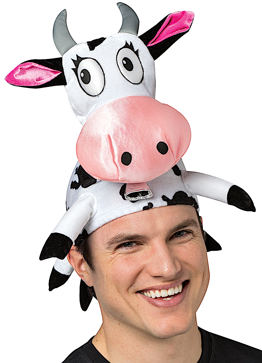 This is a soft hat in the form of a humorous white cow with black markings. It has silver horns and little black ears with pink lining. There is even a little soft cow bell around the neck!