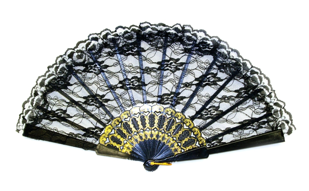 Nine inch fan with intricate lace work on a quality plastic base with decorative design.